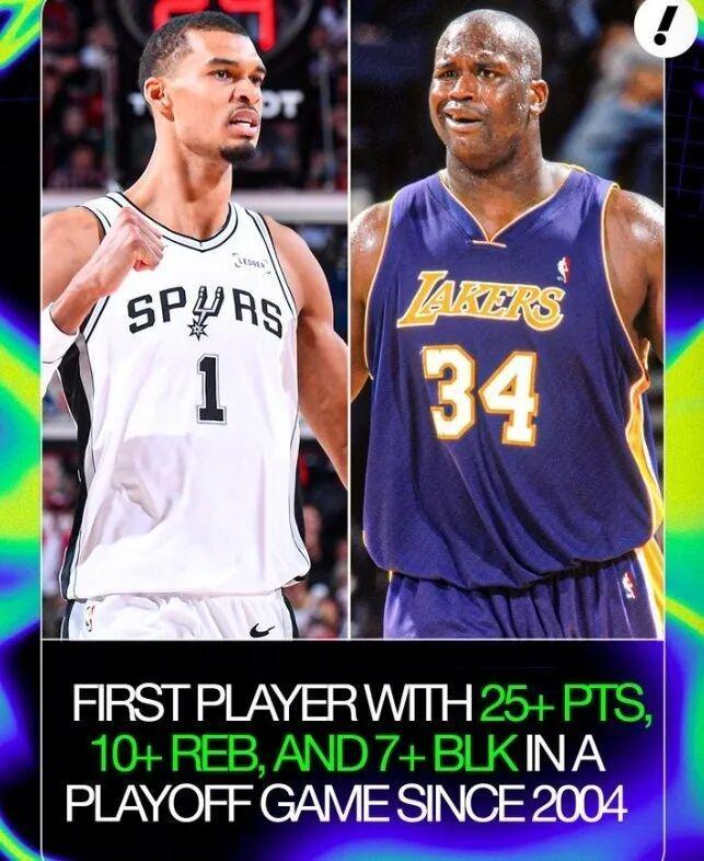 据统计,文班亚马成为自2004年的奥尼尔(次轮对阵马刺G3砍下28分15篮板5助攻8盖帽)后,首位在季后赛单场至少拿下25分10篮板7盖帽的球员。