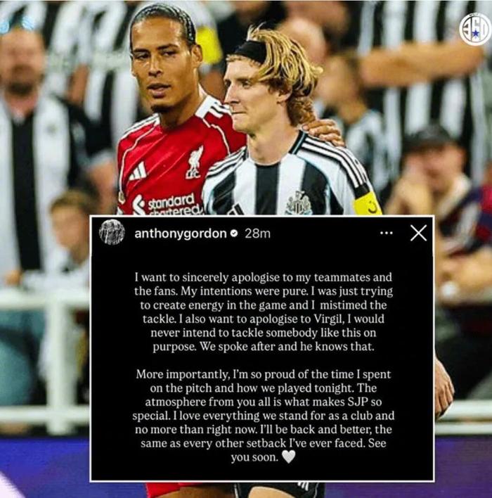 戈登在社媒上这样写道:“我想真诚地向我的队友和球迷道歉。我的本意是纯粹的,我只是想在比赛中制造活力,却误判了铲球的时机。我也想向范戴克道歉,我绝不是故意要这样铲球的。赛后我们交流过,他也明白我的意思。”